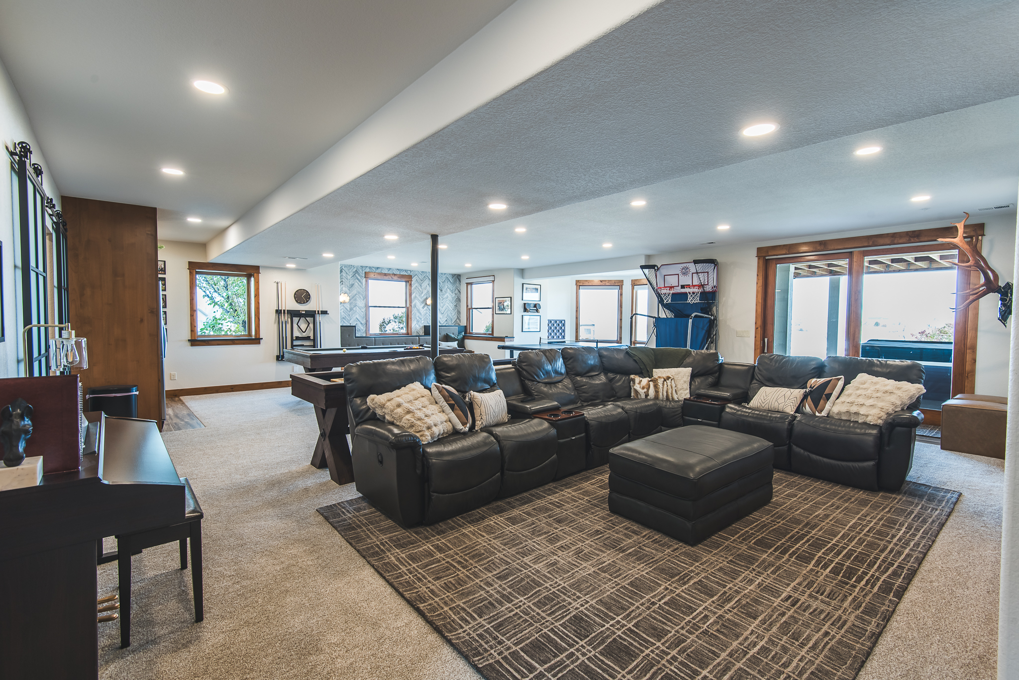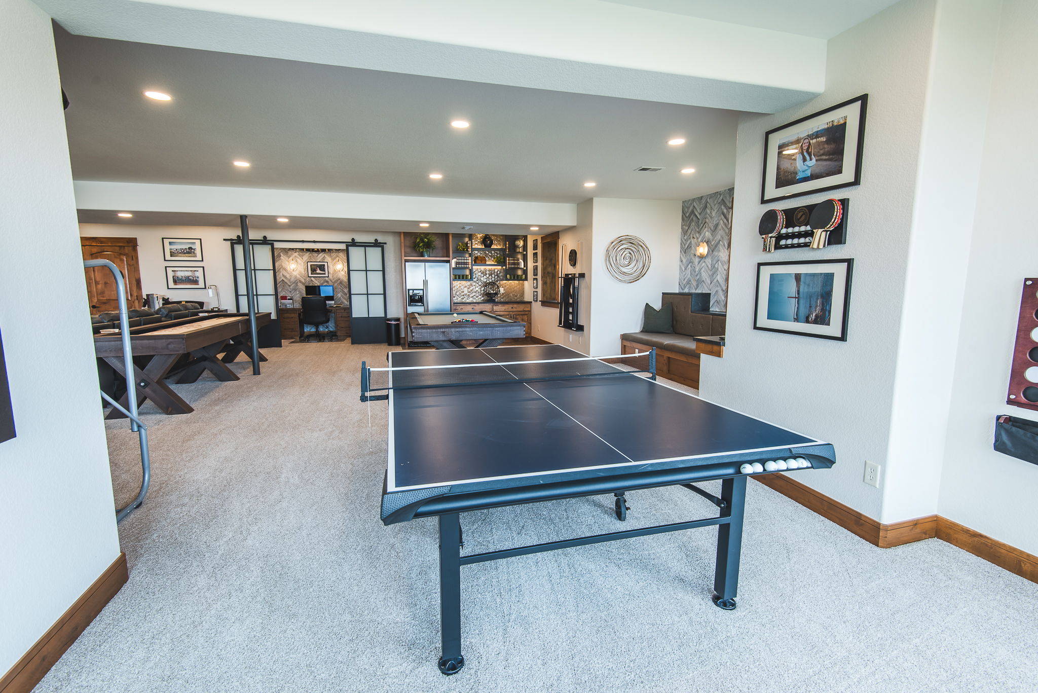 The basement underwent a complete basement remodel to create a far more functional and versatile lower level. A full reconfiguration of the floor plan was achieved by relocating the mechanical and electrical systems to accommodate the new stair placement. The finished basement now features a dedicated home office and a stylish kitchenette, making it a perfect space for work or entertainment.